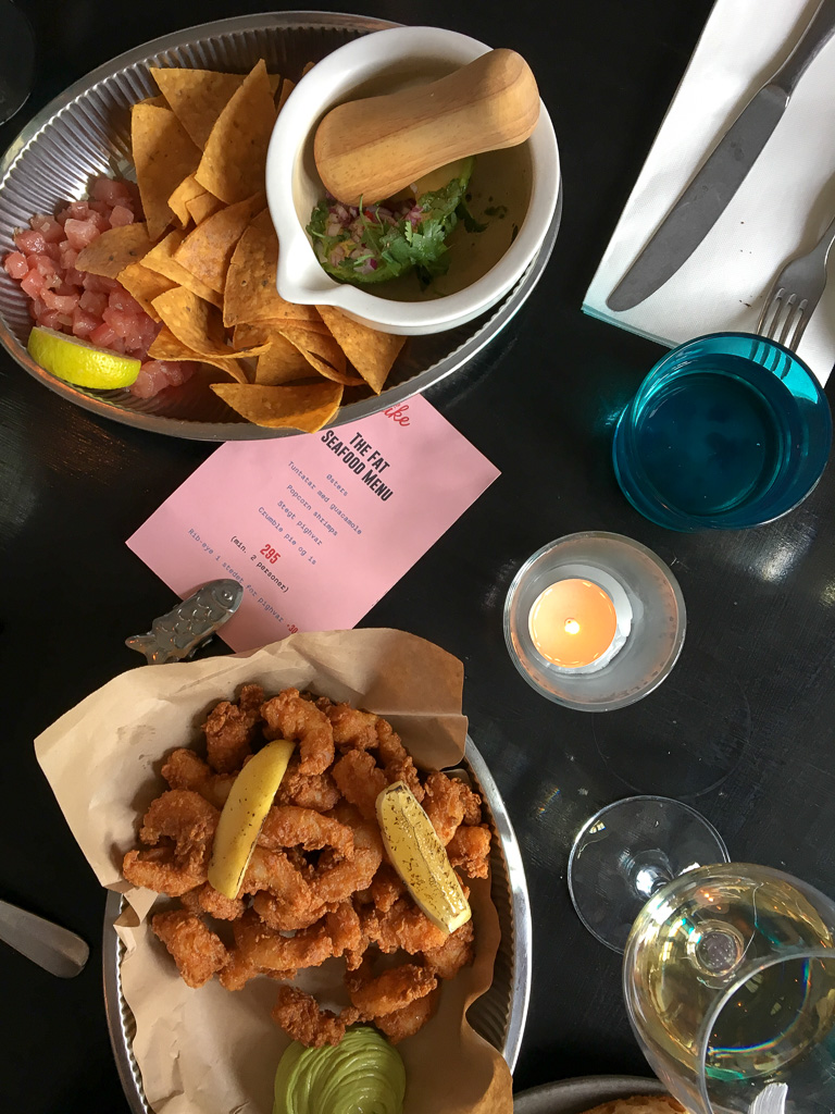 Delicious fish menu at The Fat Pike. Do-it-yourself guacamole with tuna and popcorn scrimps. YUMMY!